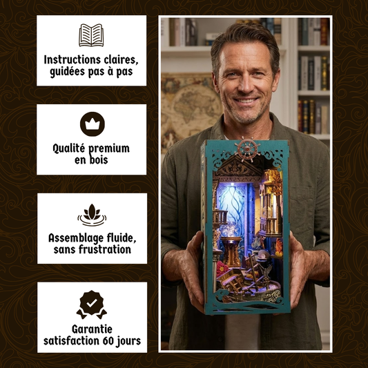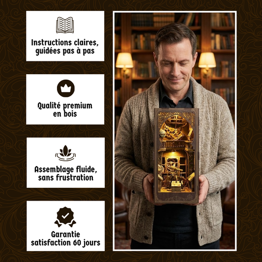Chaque création commence par un moment d'assemblage calme et se termine par une scène unique qui prend vie entre vos livres. Un détail qui attire le regard et raconte votre imaginaire.
