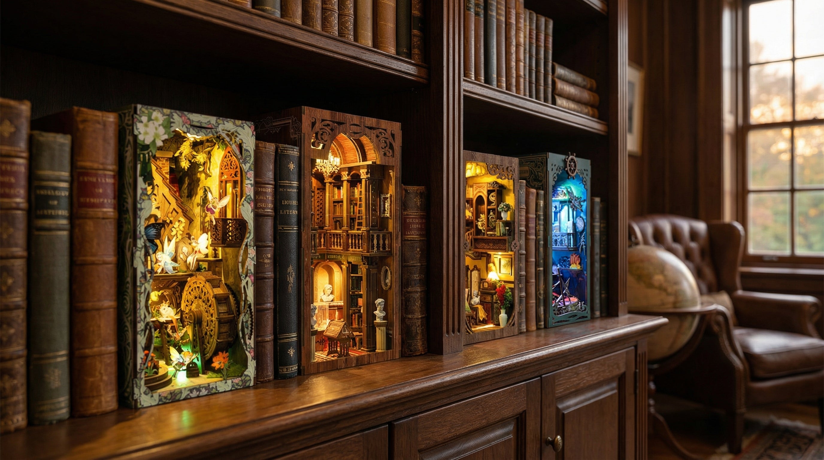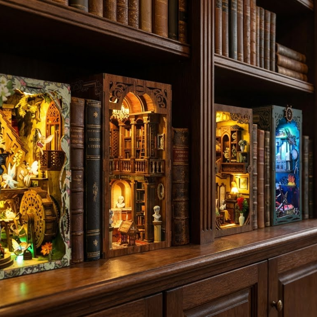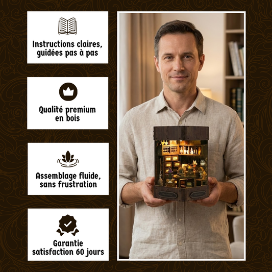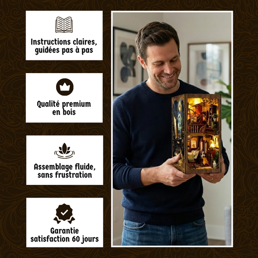 Chaque création commence par un moment d'assemblage calme et se termine par une scène unique qui prend vie entre vos livres. Un détail qui attire le regard et raconte votre imaginaire.