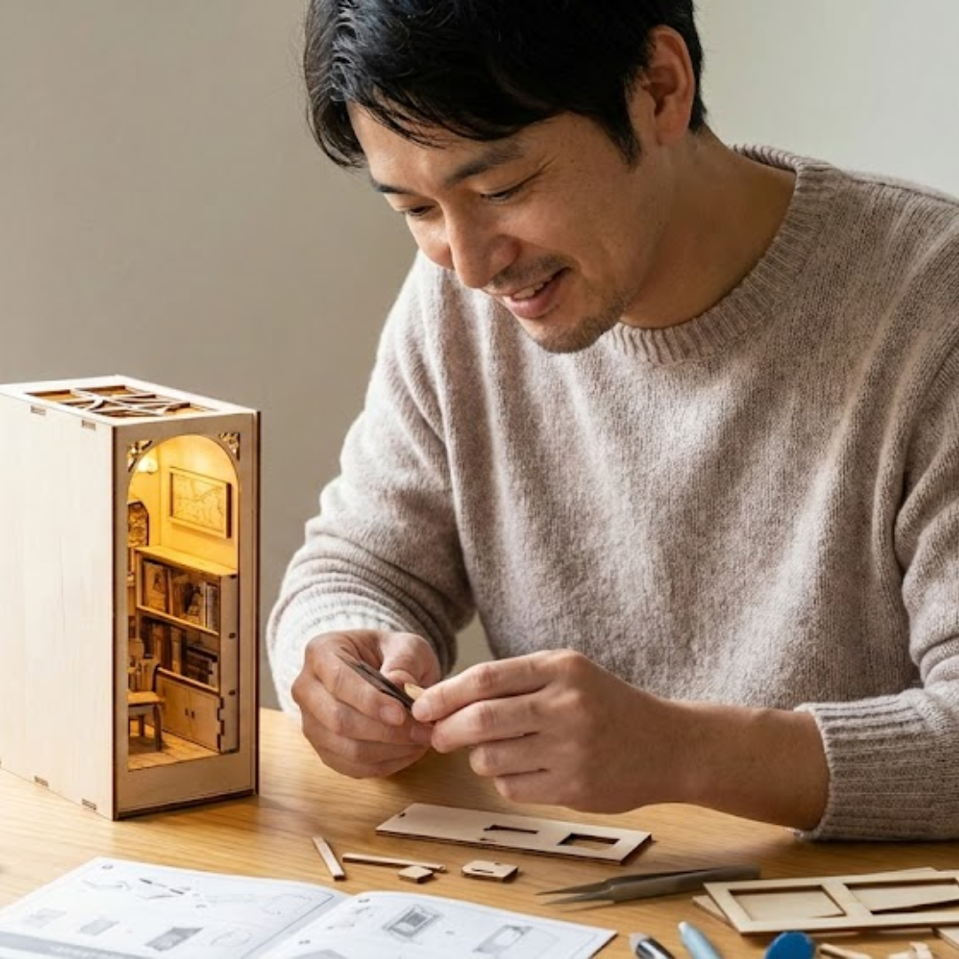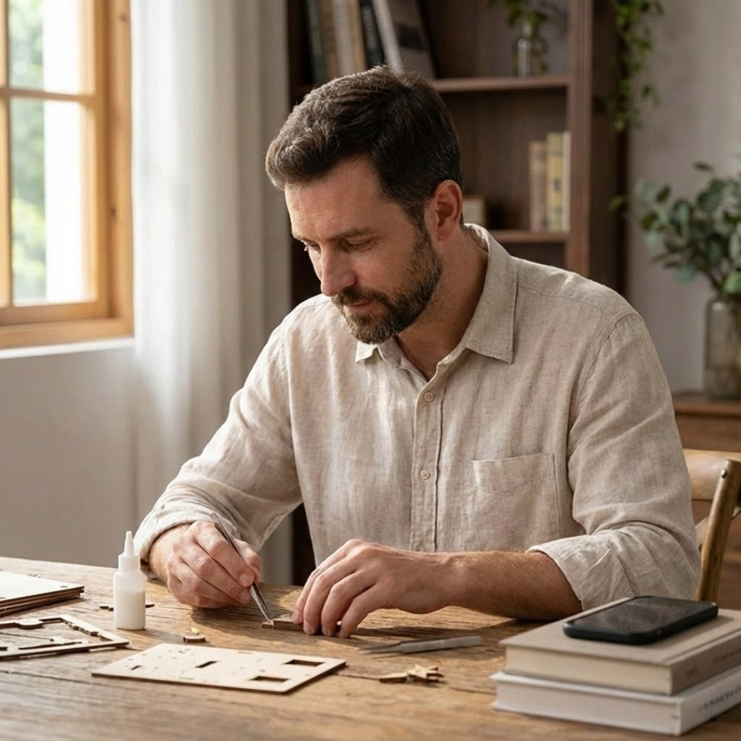 Un moment calme sans écran où concentration douce et plaisir du détail se rencontrent.