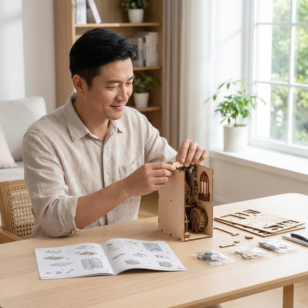 Un moment calme sans écran où concentration douce et plaisir du détail se rencontrent.